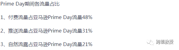与此同时,根据掌握的数据,我们现在为大家给出Prime Day期间各种流量的占比分析: