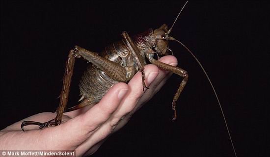 马克-莫菲特(Mark Moffett)发现这种巨型昆虫体重达到71克,是普通老鼠体重的3倍。今年53岁的莫菲特以前是一位公园管理员,他是在树上发现这只巨型昆虫的。据称,他是无意之中发现这只类似蟋蟀的昆虫,其翼展可达到7英寸,在新西兰境内遍布着70多种其他体形较小的沙螽。