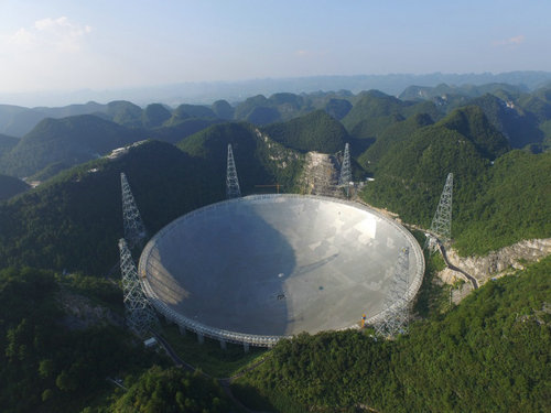 "中国天眼"位于贵州平塘县克度镇深山里的"大窝凼",坐落在几百万年前形成的喀斯特丘陵中,从山顶向下看,就像一口"大锅",其口径达到500米;其球状反射面相当于30个足球场,从底部到顶部垂直高度138米,超过世界上最大的胡夫金字塔。