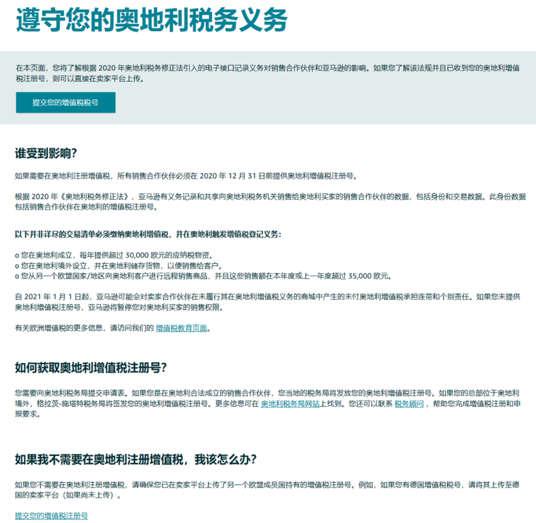 奥地利数字法案2021年1月1日生效,对于具备增值税缴纳义务但没有及时上传VAT税号到亚马逊卖家平台,您的店铺会被采取强制措施,销售权限将受限。