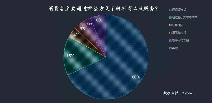 据Wyzowl此前对消费者调研的一项数据显示,有68%的消费者更喜欢通过短视频的方式去了解一款新的商品或服务,这一比列远超基于文本的文章、信息图表等呈现形式。