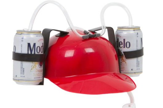其实就是头盔上面架两个圆环可以放置铝罐的啤酒和苏打水,同时两侧有软管供消费者进行吸食。可以边走边吃或者作为变装玩具。