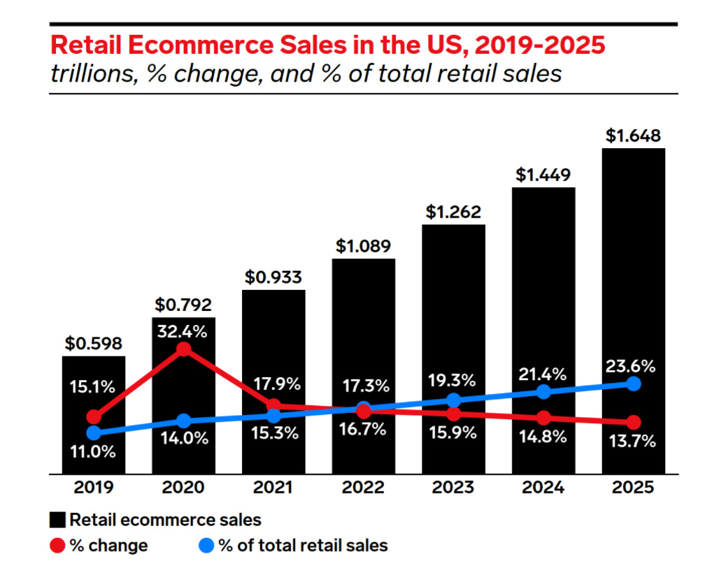 AMZ123获悉,受新冠冲击,2020 年全球零售总额下降了2.8%,降至23.624 万亿美元。但零售电子商务迎来蓬勃发展。eMarketer预计2021 年这一数字将反弹至2019年新冠爆发前的水平,增至25.052万亿美元。