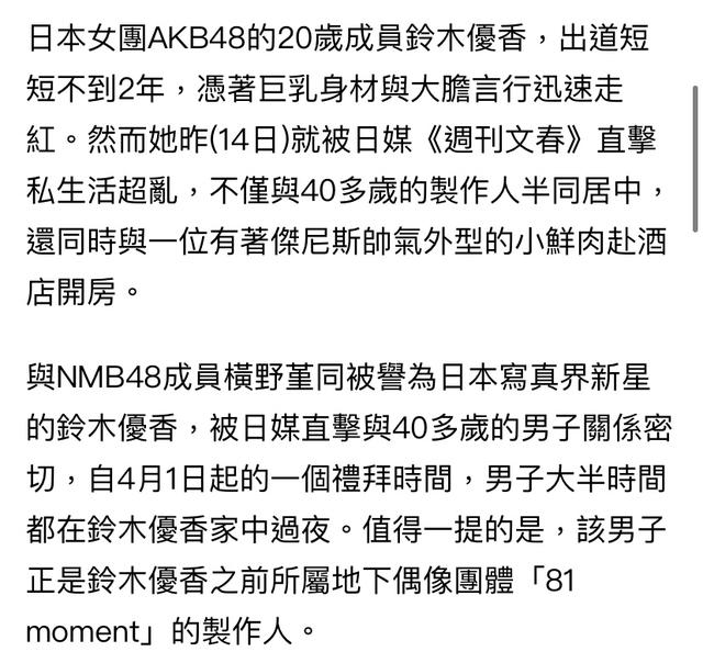 4月14日晚上,据日本媒体报道,20岁的AKB成员铃木优香被曝出私生活超混乱,一时间引发了网友们的热议。据悉,铃木优香目前正在与一名40岁的制作人同居中,自4月1起,这名制作人有一周的时间里都住在铃木优香的公寓里,不过被曝出后,铃木优香并不承认与制作人同居的事情,反而是这名制作人大方承认了同居。并且在与制作人同居的同时,铃木优香还与一位杰尼斯风格的小鲜肉帅哥开房,而与她同居的制作人也曾与一名女子共