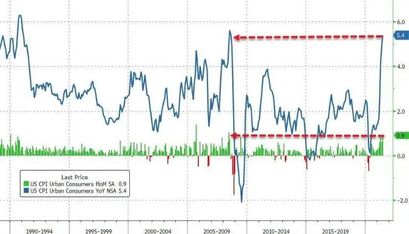 【美国6月核心CPI环比增幅创30年新高】美国6月消费者物价指数(CPI)环比增长0.9%,为2008年6月以来最大环比涨幅,同比则飙升5.4%;核心CPI环比上涨0.9%,同比上升4.5%,创30年来新高。二手车和卡车指数连续第三个月大幅上涨,6月份上涨10.5%,为有史以来最大月度增长,其中二手车占到了CPI涨幅的三分之一。