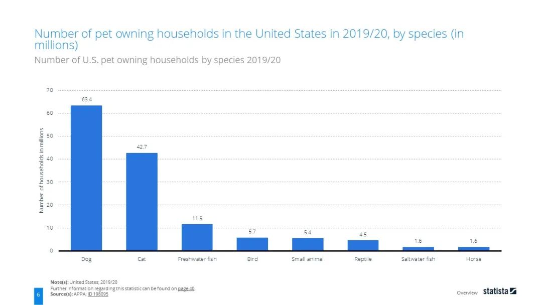 美国作为全球养宠物最多的国家,根据2019至2020年的数据显示,6340万个美国家庭是有狗一族,又有超4000万个家庭是猫奴之家。