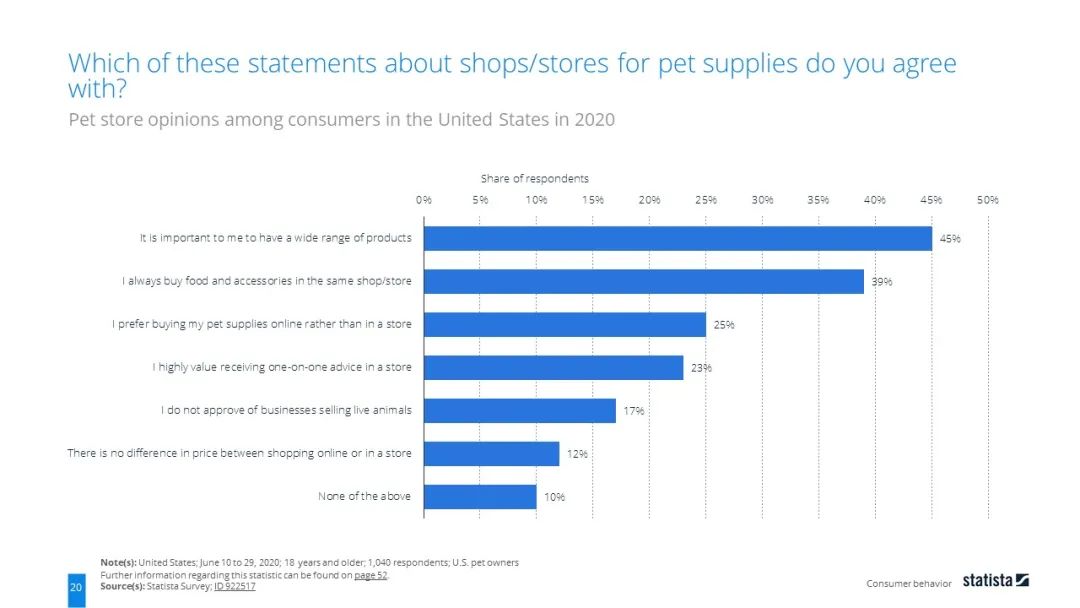 当问及美国消费者对于宠物用品商店的看法时,近一半的受访者认为有丰富的品类是吸引他们去购买宠物用品的原因。同时有四分之一的受访者表示更喜欢网购宠物用品。