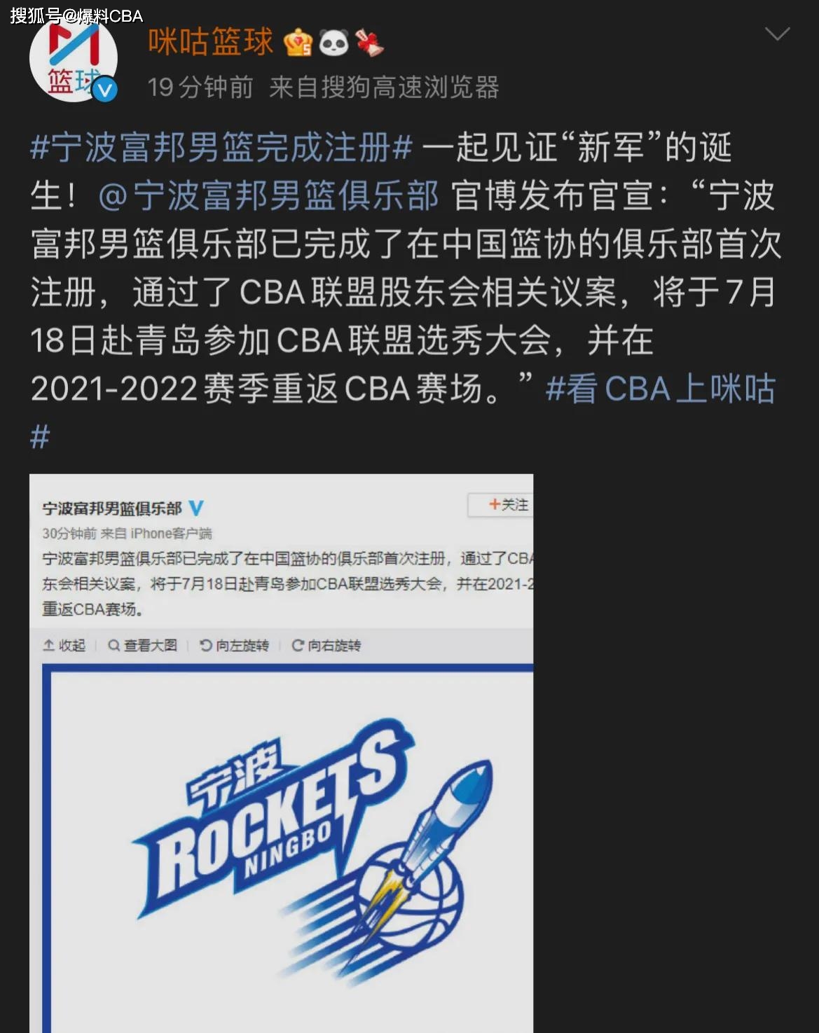 北京时间7月16日,今天下午宁波富邦男篮正式通过了CBA公司的备案,符合球队注册资格,宣告成立。并且球队的队标继承了前八一队的队标,这也算是一种传承,只是由之前的红色火箭换成了蓝色火箭。