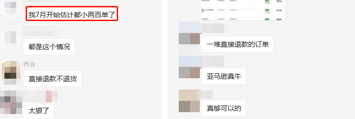 这种直接退款的订单收不到任何的退货,相当于顾客选了个理由直接就留下了产品不用付款,卖家实打实被坑掉了产品。而且大量出现白嫖订单的还不在少数,我们群就又不少卖家在反映这个情况,亚马逊可太坑了!