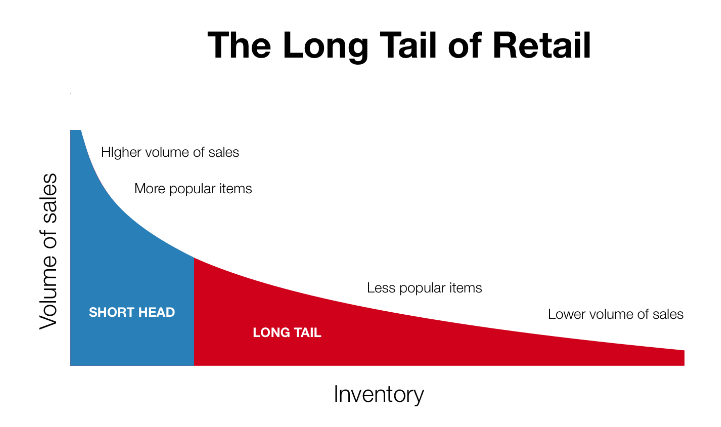 上图,红色部分(Long Tail)就是我们所说的长尾市场,最简单的总结就是:目前大部分的卖家只关注了蓝色部分(Short Head)-也就是热门关键词,大家都在这个部分去竞争,而忽略了Long Tail部分还有很多可挖掘的。