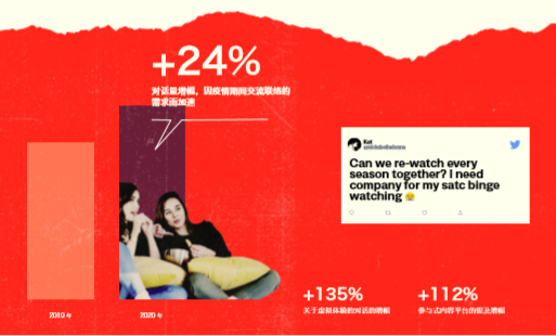 在自己舒适的家中与他人交流。人们寻求保持社交的方法,更多的对话围绕流媒体和 #bingewatching展开,这让人们因为共同的娱乐爱好聚在一起。