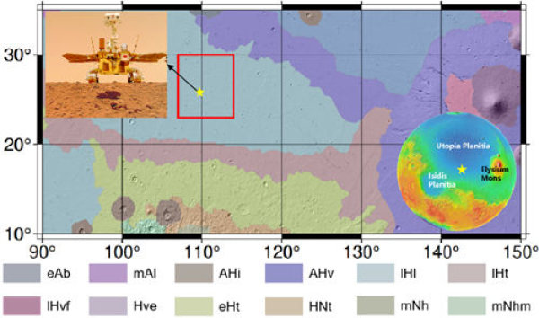 中国首次火星探测巡视器"天问一号"于2021年5月15日成功着陆于火星乌托邦平原南部。乌托邦平原形成于诺亚纪,是火星北半球最大的撞击盆地,直径约为3200km(图1)。南部、西部和东部边缘分别与伊西斯平原和埃律西昂火山地区相接,形成了广阔平原区域。地形数据表明,火星北半球可能存在"古海洋",乌托邦平原位于推测的古海岸线内,剖析着陆区的地形地貌、物质成分,对探索其地质演化历史、验证火星"古海洋"假说具有重要意义。