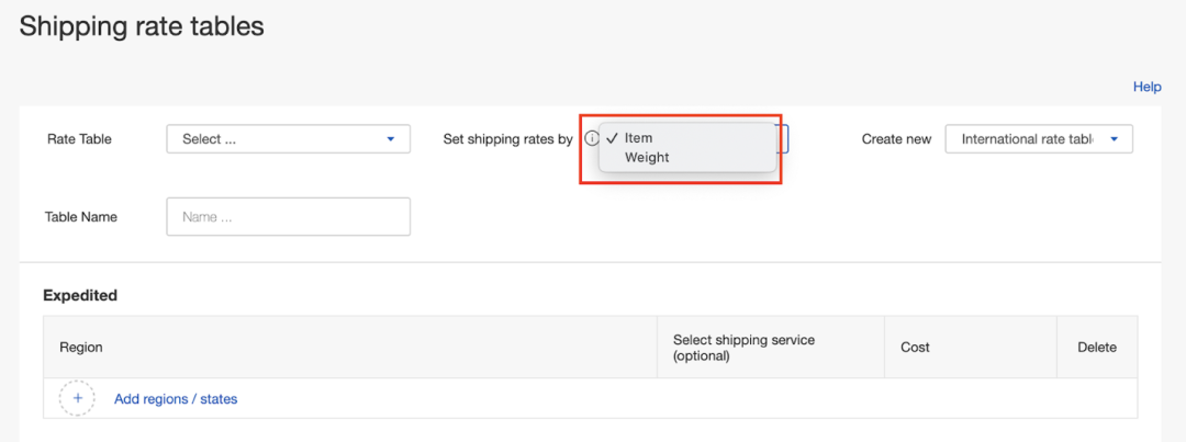 c.点击"Create"链接之后,进入到新建运费表页面,如下图所示,国际运费表的运费类型设置分为Item(类别)和Weight(重量)。