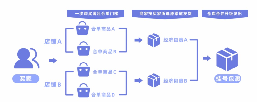 买家跨店铺购买多个合单商品,在满足合单门槛的情况下,买卖家无需支付额外物流费用,即可免费享受平邮渠道(经济、简易线路)合包升级至挂号渠道的物流服务,从而极大地缩短物流时效,减少丢率,提升买家物流体验。