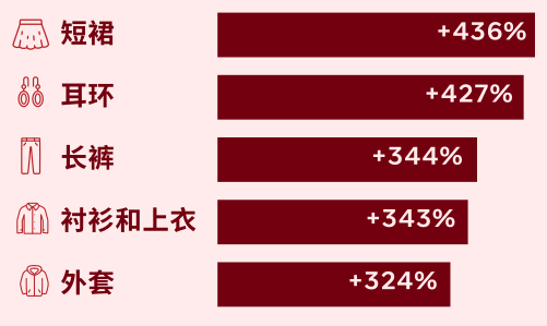 产品类别上,服装和配饰在东南亚最受欢迎。细分来看,短裙和耳环的销量攀升幅度最大。