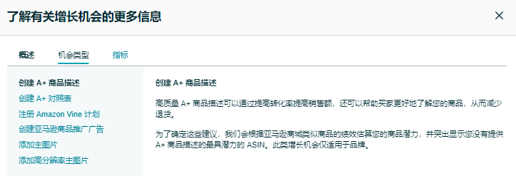 为了确定这些建议,会根据亚马逊商城类似商品的绩效估算商品潜力,并突出显示没有提供 A+ 商品描述的最具潜力的 ASIN。此类增长机会仅适用于品牌。