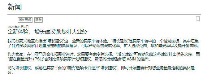为了帮助卖家提高转化率,扩大选品范围等,亚马逊在11月3日推出了新的卖家平台体验——"增长建议"