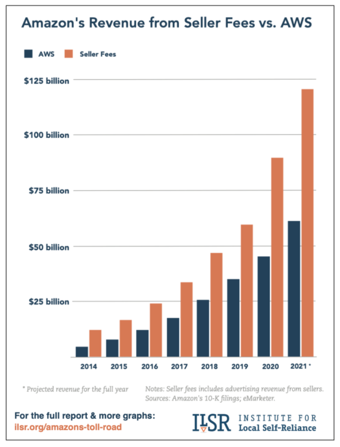 最近"Local Self-Reliance"研究院发布了一个报告,通过调研亚马逊过往多年的财报以及相关报道,研究人员发现,亚马逊在站内收取的卖家费用,简直就说一个巨大的收费站,收入增长速度远远快于它其他业务单元的收入来源!