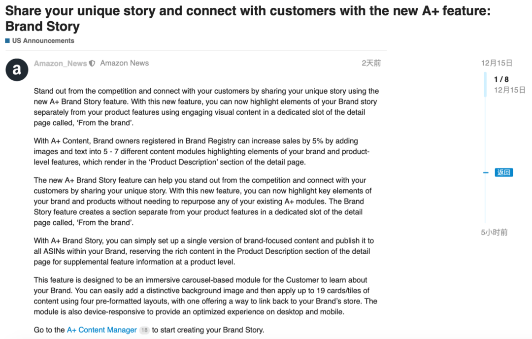 亚马逊最近又推出了一项新功能,"BrandStory"(品牌故事)。这个功能的发布,推动卖家继续向着品牌建设的方向进发。从"搬砖"到"品牌",卖家的高维升级之路全面展开,不可逆转了!关于这项功能发布的详细介绍,大家可以参考卖家论坛中的美国站官方发布。值得和大家分享的几个要点是:-"品牌故事"在A+页面的内容管理器中,通过"Fromthebrand"(来自品牌)详细信息页面的专用栏目,可以设计引人入
