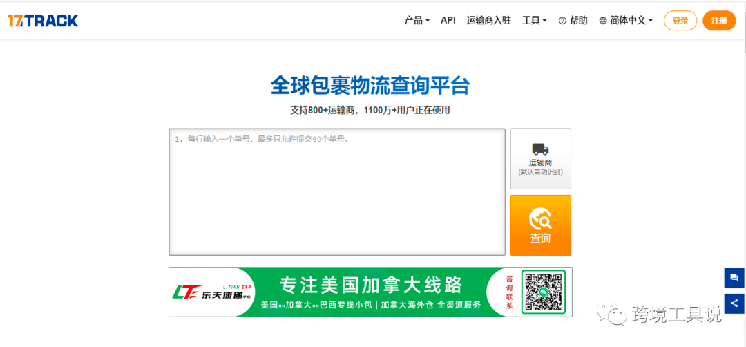 有些朋友可能没听过17track,这里简单介绍一下,官网这么介绍的:致力为全球用户提供国际物流包裹一站式查询服务,打造专业、准确、智能的跨境物流综合平台!目前支持800+运输商,1100万+用户正在使用,支持30+语言,覆盖220+国家,累计查询单量60亿+,是跨境物流查询领域的第一名,这个领域的其他玩家可以参考之前的一篇文章《常用跨境物流跟踪工具有哪些?》,不过貌似trackingmore涉嫌抄袭侵权,目前网站已经打不开了~