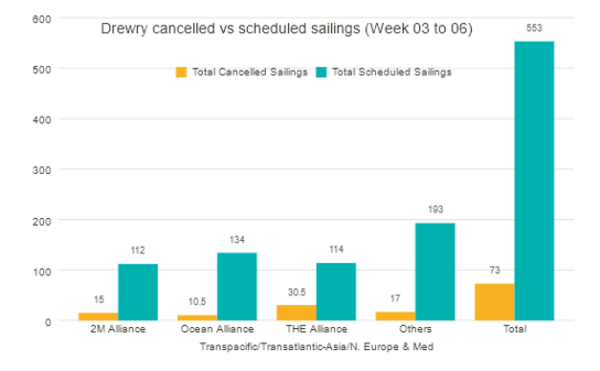 根据德鲁里最新发布的航次取消跟踪报告,在跨太平洋、跨大西洋和亚洲-北欧和地中海等主要航线的553次定期航班中,在第3周至第6周期间,有73次航班被取消,取消率为13%。