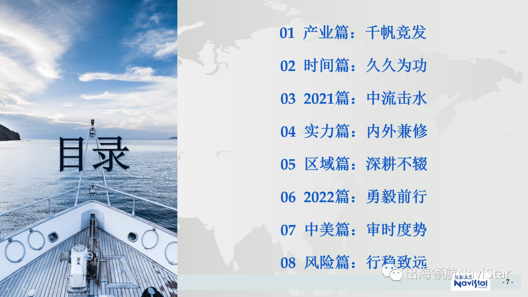 基于调研数据,经过系统的分析整理,出海领航团队重磅发布《出海领航2022年度百家中国制造企业出海调查报告》,报告共分为八个篇章,分别是:产业篇、时间篇、2021篇、实力篇、区域篇、2022篇、中美篇、风险篇。