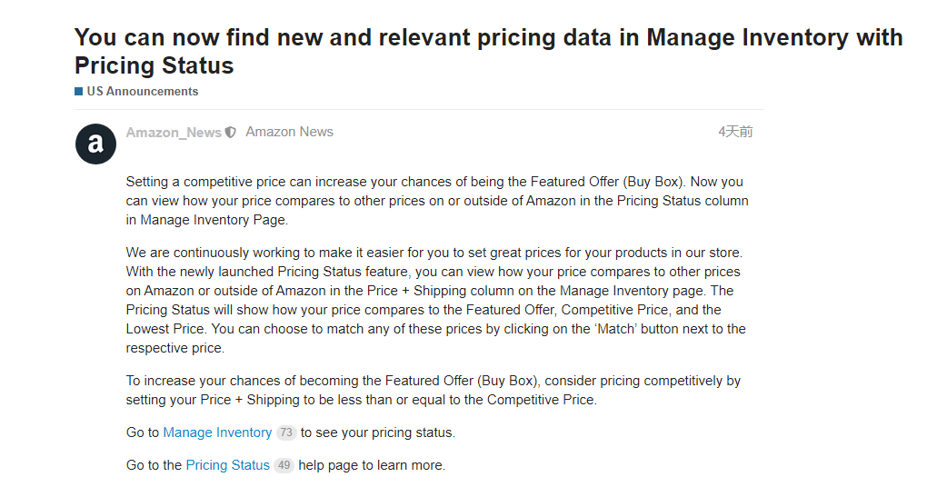 近日,亚马逊更新公告称,其后台增加了"价格比较"功能,借助此工具,卖家可以为产品设置具有竞争力的价格,从而提高产品赢得Buy Box的几率。