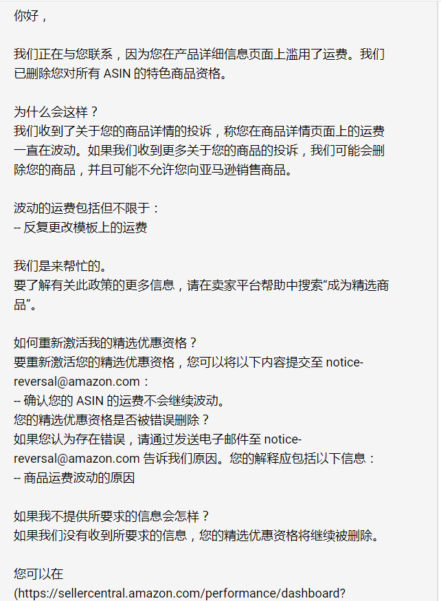 最近有卖家朋友在"跨境绝版祥"的卖家交流群里说到店铺自发货的listing全部失去了购物车,随后也收到了亚马逊的绩效通知,原因是亚马逊发现卖家在商品详情页上的运费一直在波动。