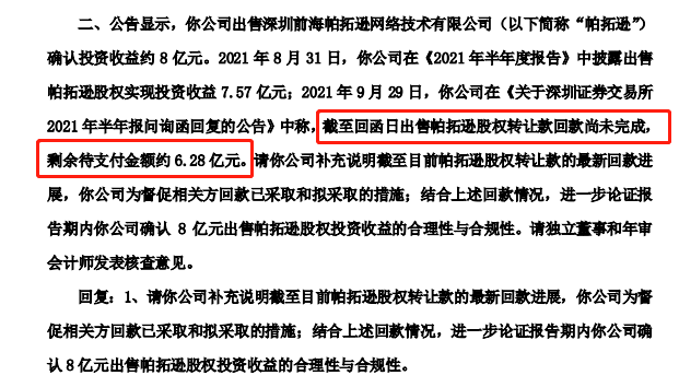 出售帕拓逊股权转让款剩余待支付金额约6.15亿元。