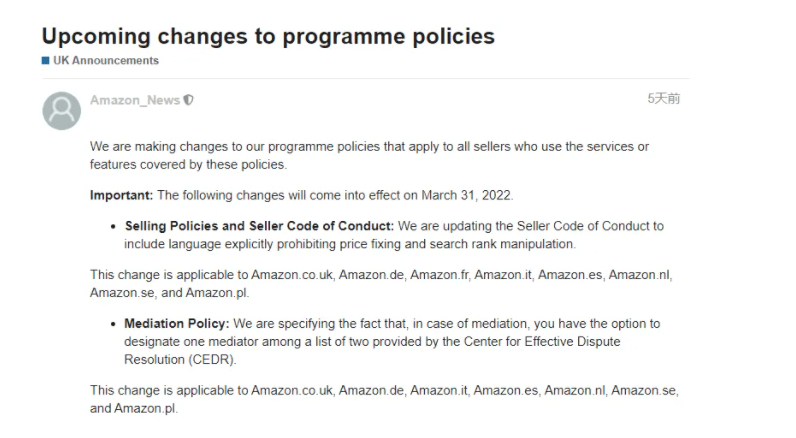 亚马逊正在更新其影响商品定价、调解和翻新的欧洲销售政策,新政策将于2022年3月31日生效。