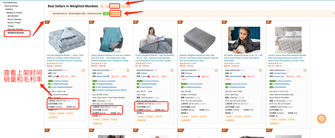 可以看到,在Weighted Blankets 这个类目节点的时候,我们通过数据查看这个类目的月均销量达到1231;月均销售额高达64510美金,市场需求大。但是我们看到新品率只有4%,看来新品的机会不大。所以我们需要考虑其他的类目节点,选择最合适的类目节点。
