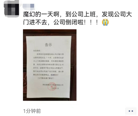 据爆料,一位深圳跨境运营周末去上班时,却发现公司大门紧闭,而从物业在门上张贴的告示才得知该公司已经倒闭跑路。