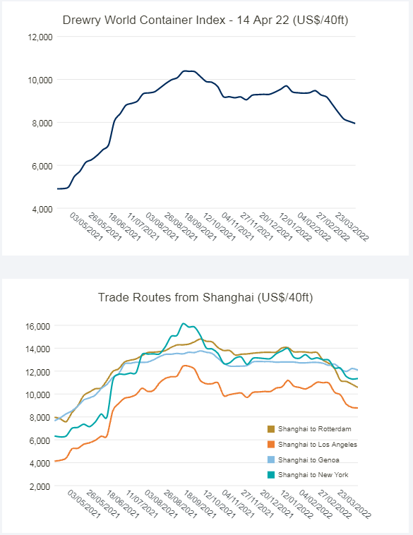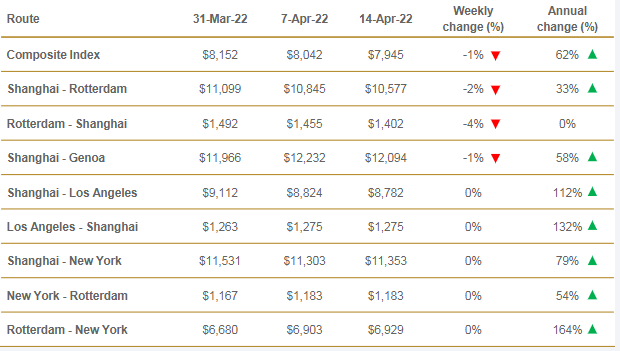 上海仍处于封控中,部分区域有可能在近期解封。华东和华北地区的其他城市也出现病例。工厂生产、仓库和卡车运输服务供应受到影响,不过港口码头和卡车运输仍在全面运行。所有海运联盟的不分货类运价和即期运费舱位都有供应,但承运商仍在限制长期大客户交易。为应对近期形势变化,预计承运商可能会公布跳港和空行措施。海运费仍处于高位,但由于市场放缓,3月份之后到4月份开始时价格整体呈现下降趋势。