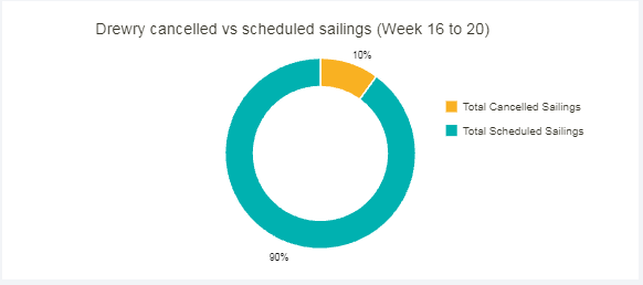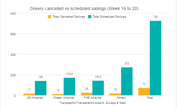 根据德鲁里日前发布最新数据,接下来的5周(第16-20周)里全球三大航运联盟陆续取消了多个航次,其中取消航次最多的是THE联盟取消25个航次;2M联盟达到17个航次;最少的海洋联盟取消12个航次;合计54个航次。