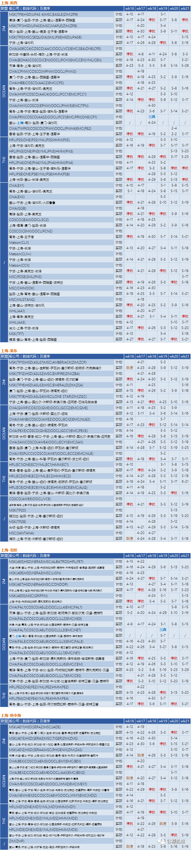 以下是容易船期统计中国大陆到北美、欧洲和地中海第16-21周(2022/4/10起-2022/5/21止)停航跳港汇总: