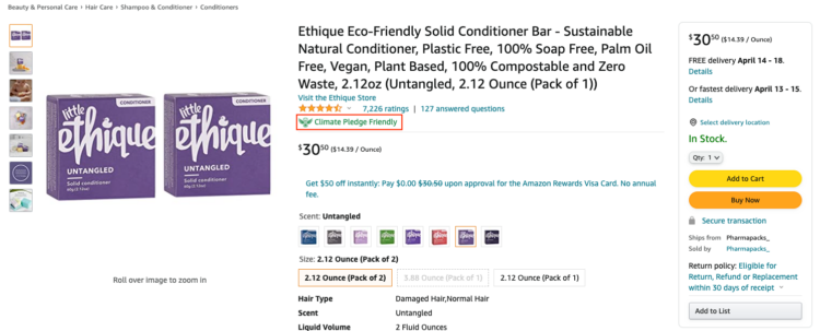 上图这款带有气候承诺友好徽章的固体护发素的在六个月内销量飙升了 14,000% 以上。对于一位好评用户来说,仅仅是环保包装就足以吸引他们购买。