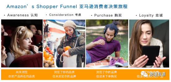 "认知-考虑-购买-忠诚"这4个阶段,而任何一个阶段都有可能会影响消费者对你的品牌的购买欲望,而亚马逊做的是搜索电商,如何让消费者认知到你的品牌呢? 首先靠的就是广告和listing的搜索排名,接下来就按照如何让消费者