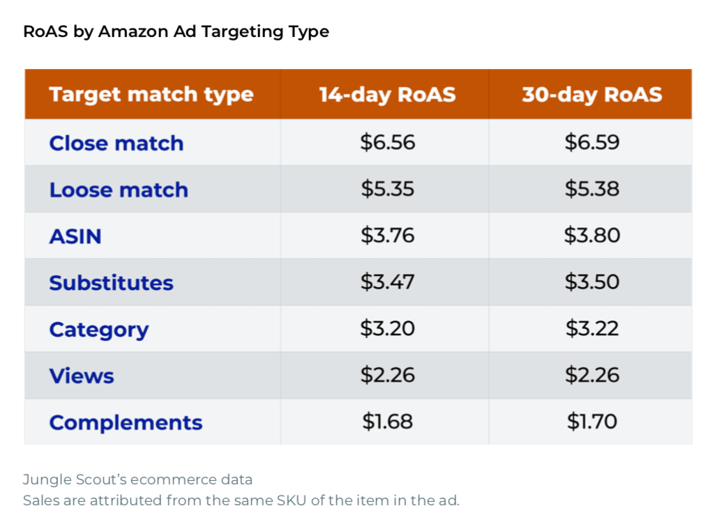 匹配方式的不同也会影响RoAS。根据Jungle Scout 的统计,精准匹配的RoAS最高,因为精准匹配能够匹配到与买家搜索最相关的关键词,紧随其后的是广泛匹配、同类商品、互补商品。随着时间的迁移,RoAS还会略微上涨。