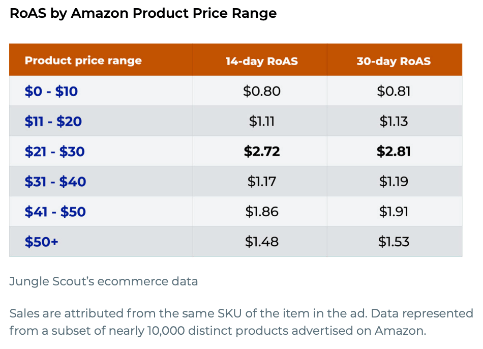 虽然 RoAS 通常会随着产品价格的增加而增加,但价格在 21 美元至 30 美元之间的产品 RoAS 最高。