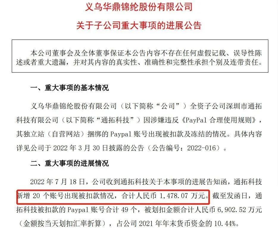 通拓科技被扣近7000万根据通拓科技母公司华鼎股份最新披露,通拓科技因涉嫌违反《PayPal合理使用规则》,其独立站(自营网站)捆绑的Paypal账号再次出现了被扣款及冻结的情况。