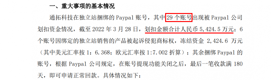 据了解,今年3月,华鼎股份也曾披露过,通拓科技独立站绑定的29个PayPal账号出现被Paypal公司划扣资金情况,划扣金额合计人民币5,424.5万元;6 个账号因绑定的独立站销售的产品被起诉侵犯商标权,冻结资金2,424.6万元。