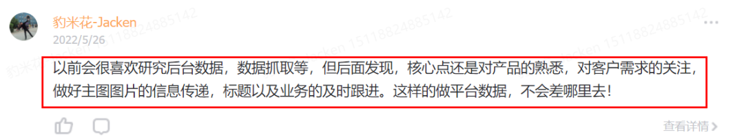 以前会很喜欢研究后台数据,数据抓取等,但后面发现,核心点还是对产品的熟悉,对客户需求的关注,做好主图图片的信息传递,标题以及业务的及时跟进。这样的做平台数据,不会差哪里去!