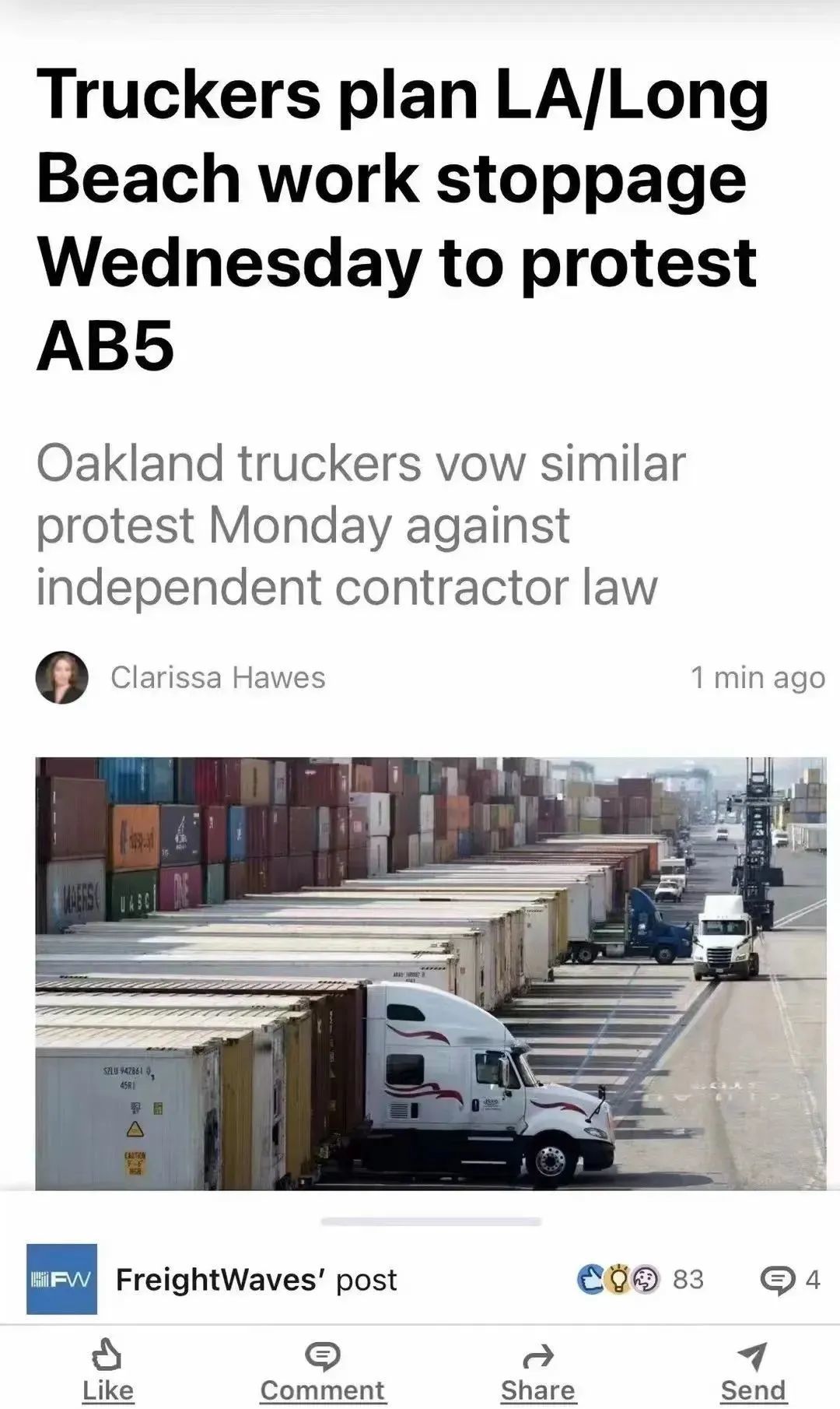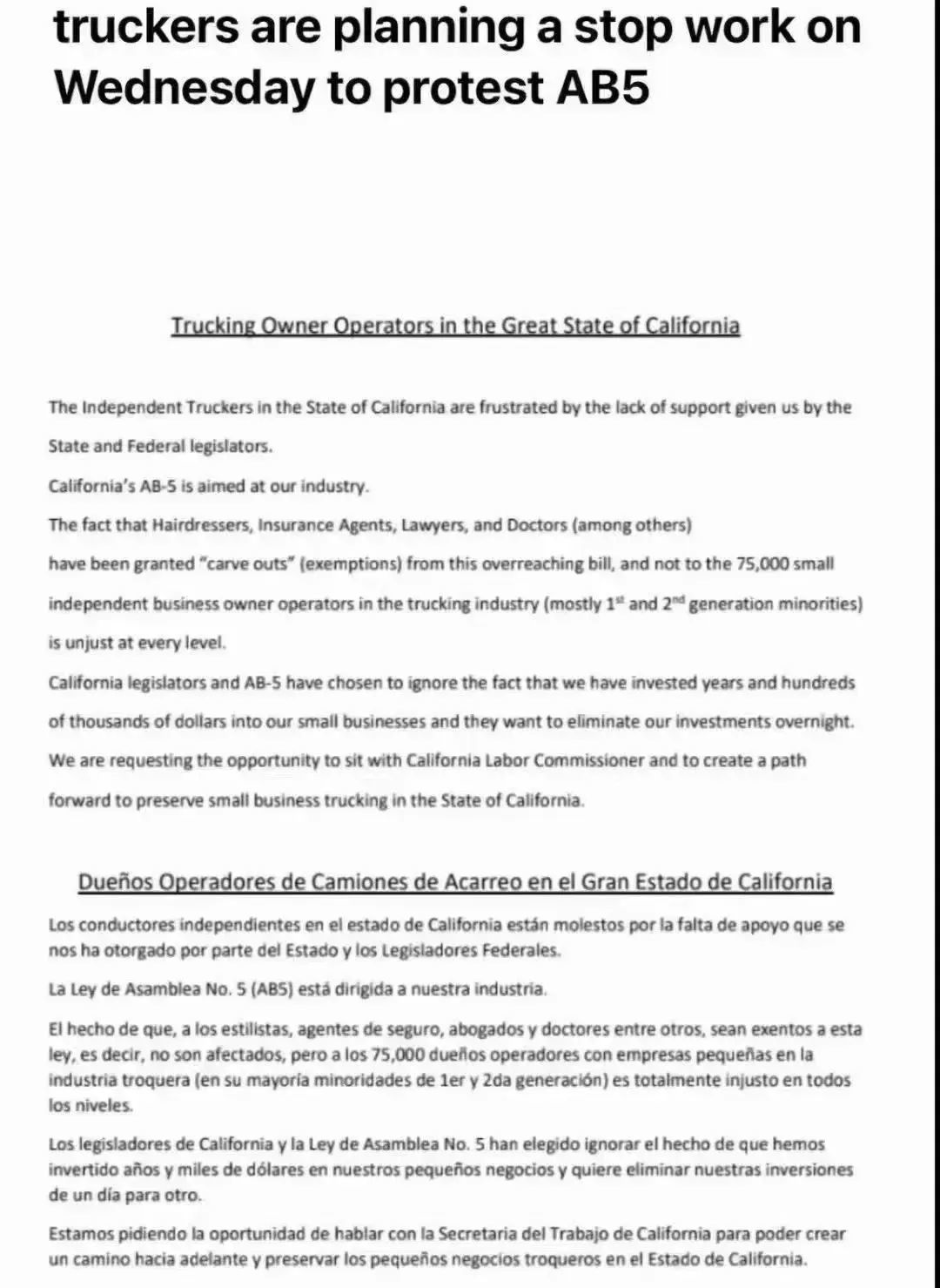 据悉,原因是抗议一项名为"AB5",涉及卡车运输行业、且有争议的加州法律。这项名为AB5的法案旨在限制独立承包人( independent contractor)的工作,并在很大程度上把他们归为雇员司机、而非官方认可的运输承包人。