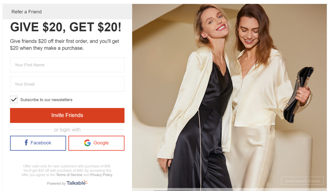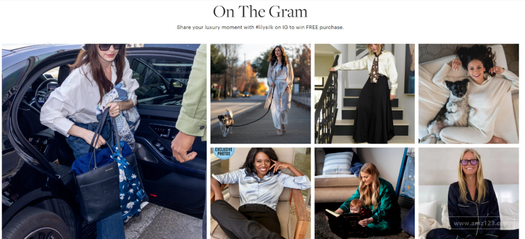 作为DTC品牌,一个明显的优势正是可以最大程度地缩短了用户触达的距离,又通过产品共创、社交营销实现的用户心理共振,挖掘用户的最大价值,实现品牌和产品的双赢。 对于Lilysilk来说,它也将"用户共创"这一招用得十分巧妙——在官网上,就好几种与用户"对话"的方式: 01、善用免单奖励鼓励用户分享;Lilysilk鼓励用户在Ins上做内容分享,分享内容带有#lilysilk 的话题标签,就有机会获得免单奖励。 这样的做法即有利于提高社媒及谷歌关键词搜索排名,也有利于打通社媒与独立站,形成渠道优势互补,提高品牌影响力。 02、鼓励用户之间互相推荐;