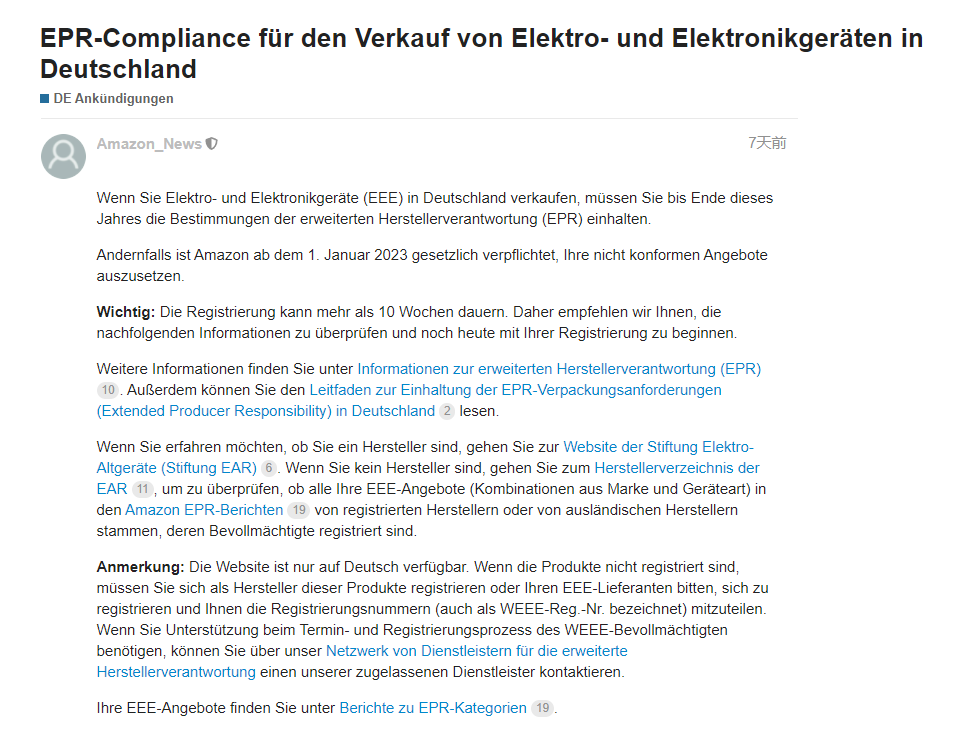 近日亚马逊德国站卖家论坛发布公告,在德国销售电气和电子设备 (EEE),则必须在今年年底之前遵守生产者责任延伸 (EPR) 规定。否则,从 2023 年 1 月 1 日起,亚马逊必须依法暂停您的不合规商品。公告如下: