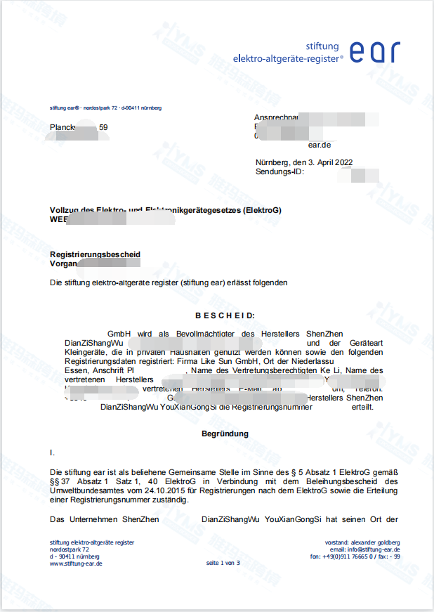根据2005年3月16日颁发的ElectroG法令, 欧盟境内所有电子产品需注册回收。当地政府下设置回收公司,回收公司一方面为电子产品的无公害处理负责, 另一方面在公司不再当地市场经营该产品的前提下(破产或者撤离),继续对该产品的后续处理负责。商家在和回收公司签订回收合同后,由回收公司担保处理电子垃圾,资料提交当地政府审核后,由当地政府颁发WEEE-Reg-Number.