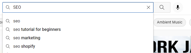 首先,我们可以在YouTube搜索你的目标关键词,查看它给出的关键词联想。以SEO为例: