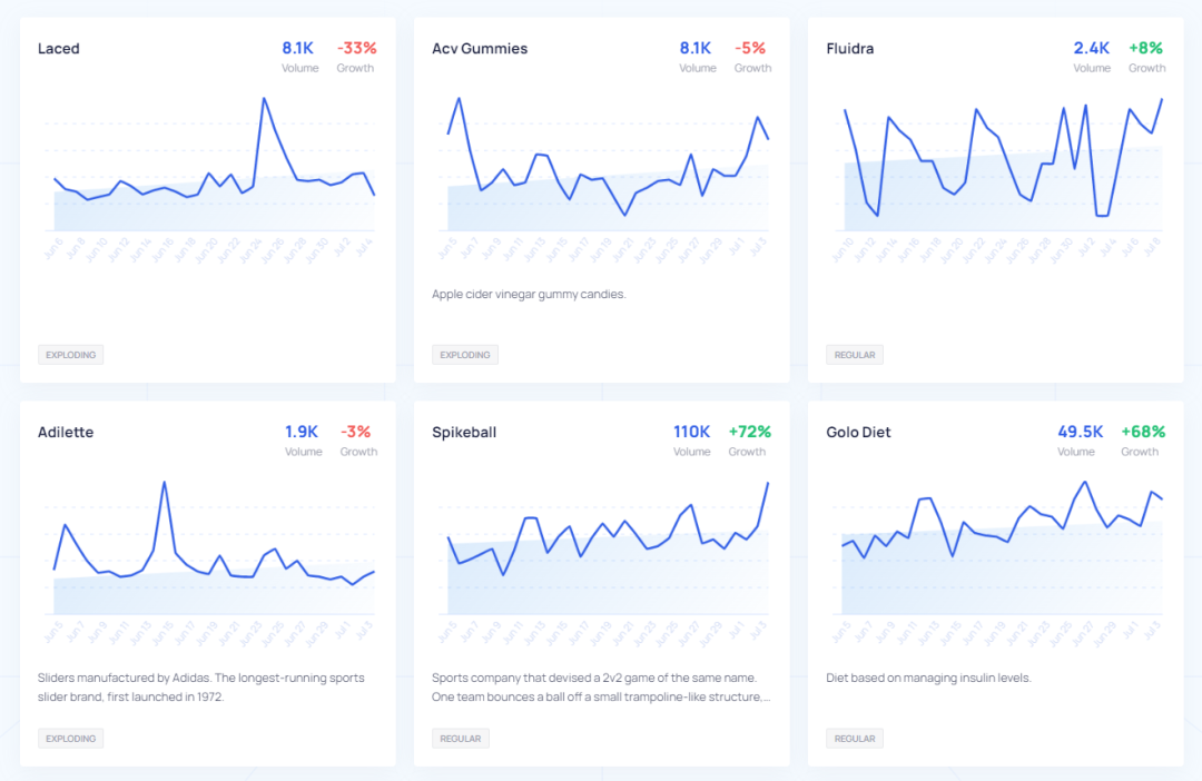 我们还可以使用explodingtopics.com的免费关键词工具,可以搜索到数十个行业的最新关键词趋势。