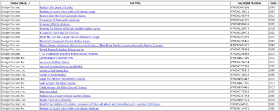 Design Toscano 官网上的大多数产品都注册有美国版权,目前可查询注册版权共有115项,作品名称与版权标题相似,以下只展示部分: