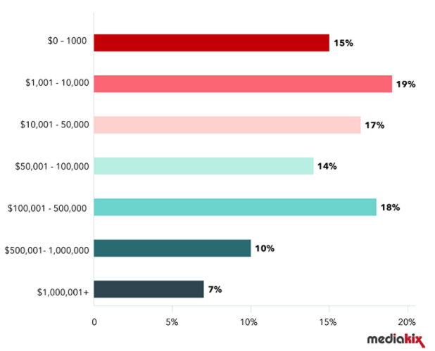 # 以50,000美金为分界线,网红营销年度预算在0-50,000美金的广告主占比为51%($0-$1000:15%,$1001-$10,000:19%, $10,001-$50,000:17%);